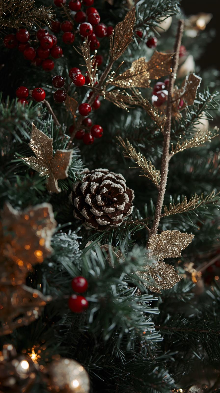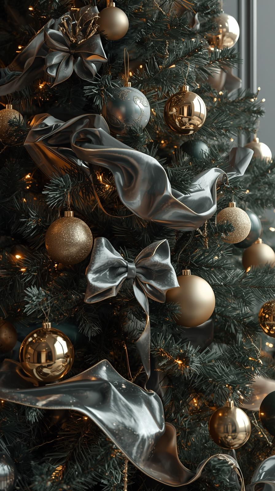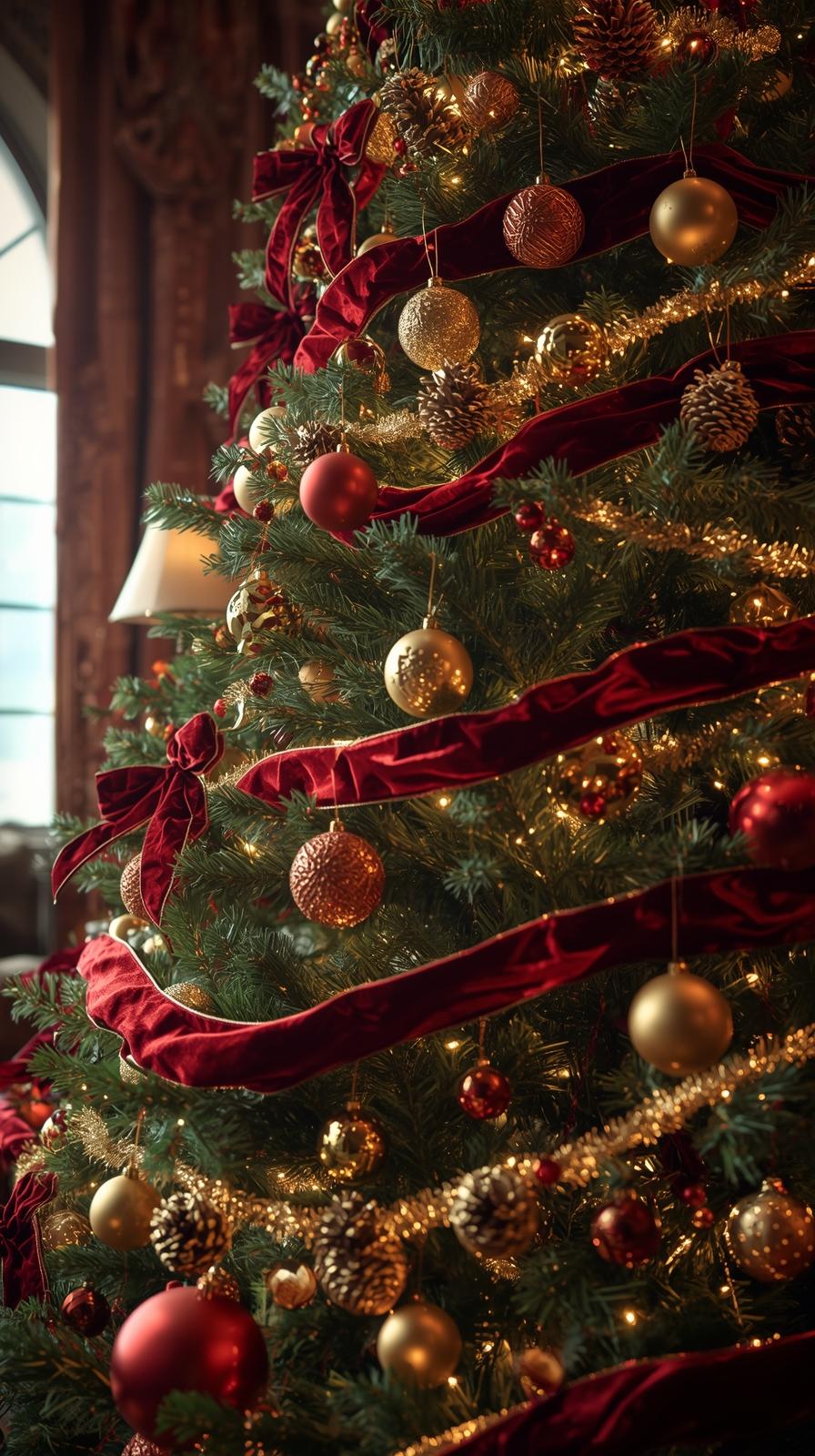 This evergreen combination offers warmth, elegance, and a familiar holiday spirit. Red velvet ribbons, gold metallic ornaments, glass baubles, and warm-white lights pair beautifully to create a timeless appeal. For extra richness, incorporate textures like velvet bows, gilded pinecones, and brushed gold tree picks.