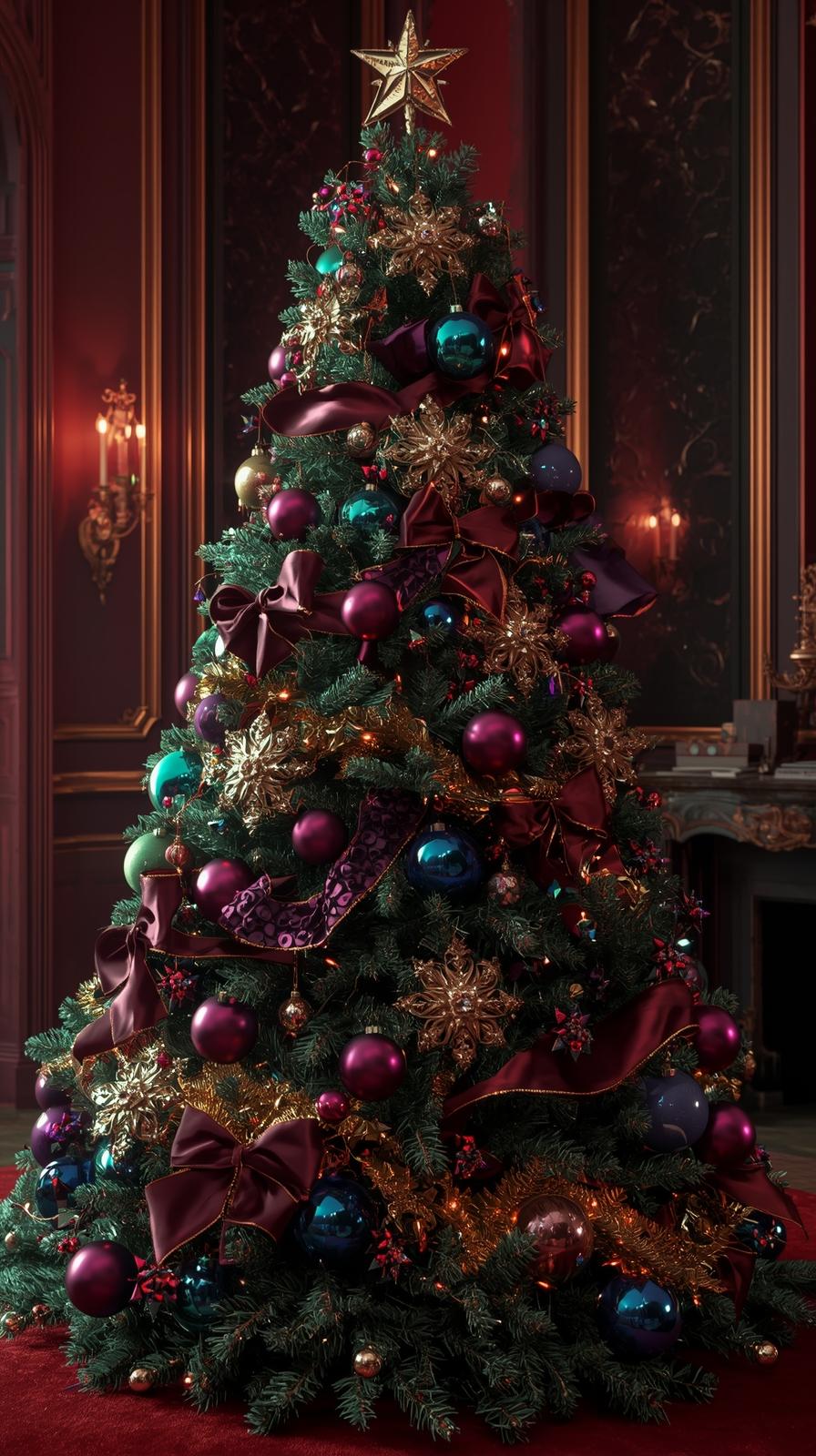 Deep emerald, sapphire, burgundy, and plum ornaments provide a rich, sophisticated look. These shades pair particularly well with dark green trees or flocked trees. Crystal accents, gold leaf ornaments, and dark satin ribbons enhance the depth of this theme.