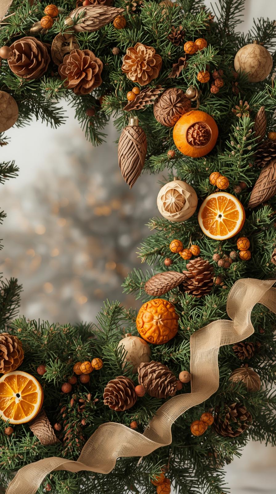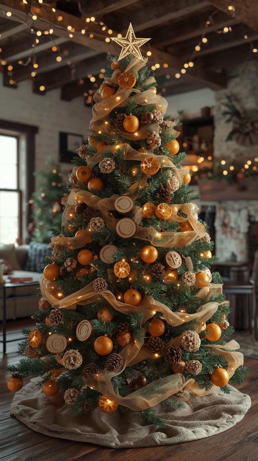 For a cozy and organically inspired tree, combine wooden ornaments, dried orange slices, pinecones, burlap ribbon, and natural twine. This look works well in living rooms with neutral palettes, farmhouse interiors, and cabins.