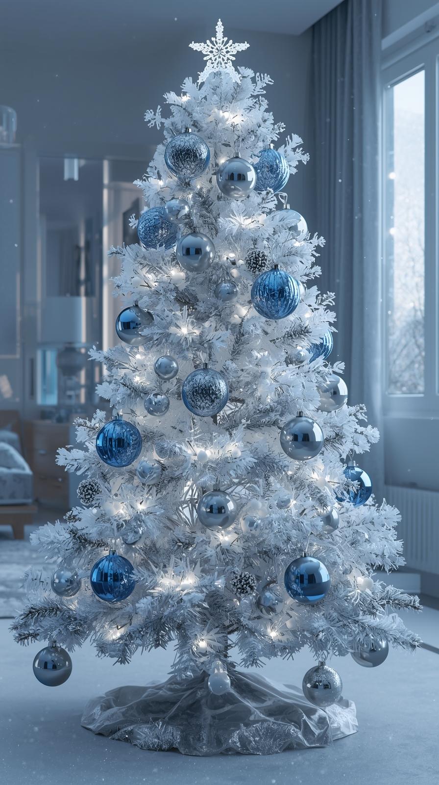 Silver, icy blue, glass, and clear acrylic ornaments create a frosty winter aesthetic. Add faux snow spray, white berry picks, and cool white LED lights to complete a crisp, shimmering holiday feel.