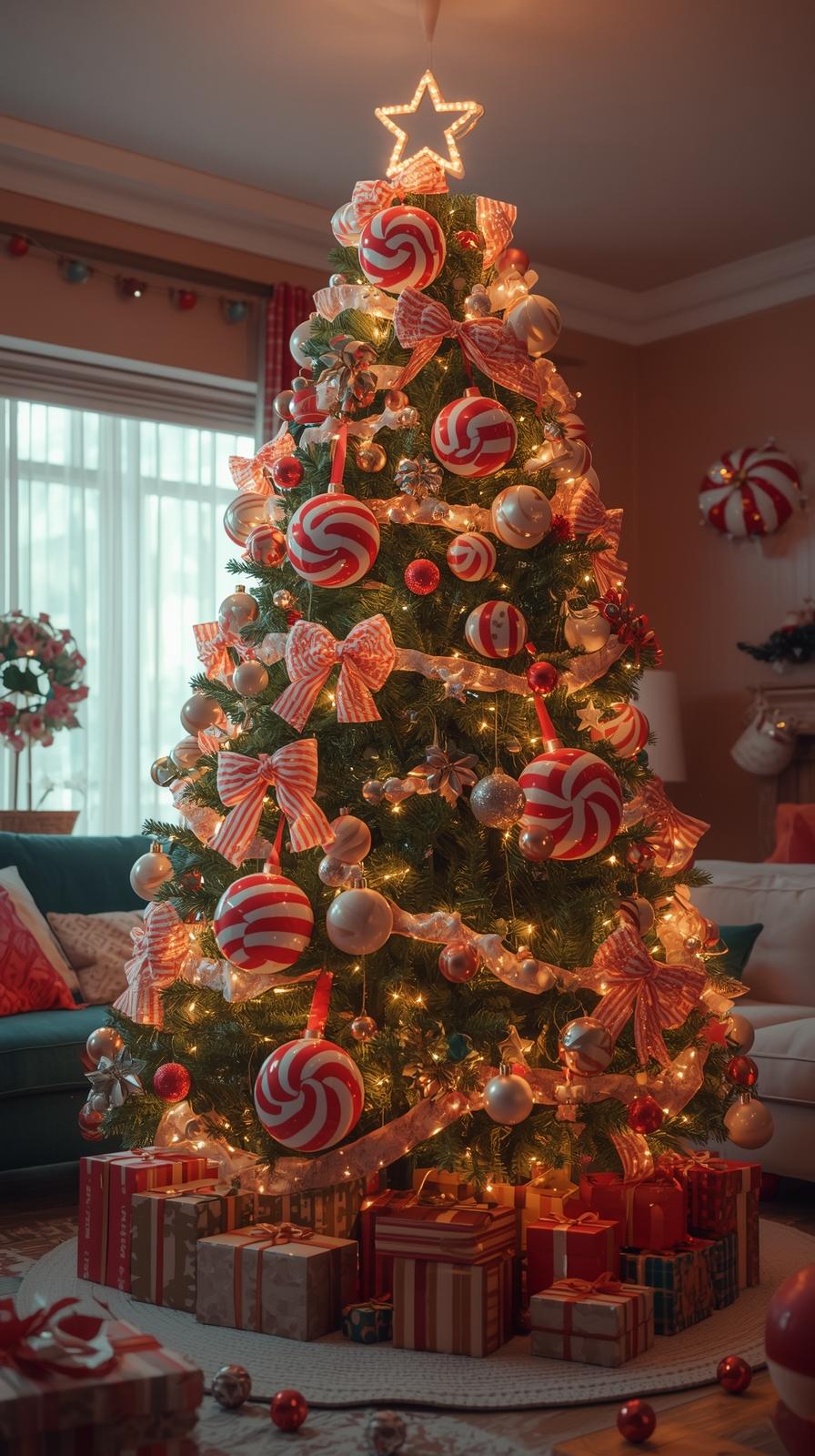 Bright colors, oversized ornaments, striped ribbons, candy-inspired décor, and unique shapes bring fun and imagination to the space. This style works perfectly for families with children or creative households.