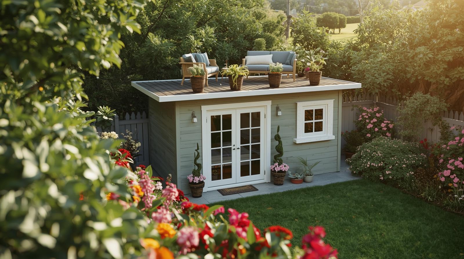 For a unique twist, some garden sheds can feature a rooftop deck. This design maximizes space and offers a cozy outdoor seating area with a beautiful garden view.