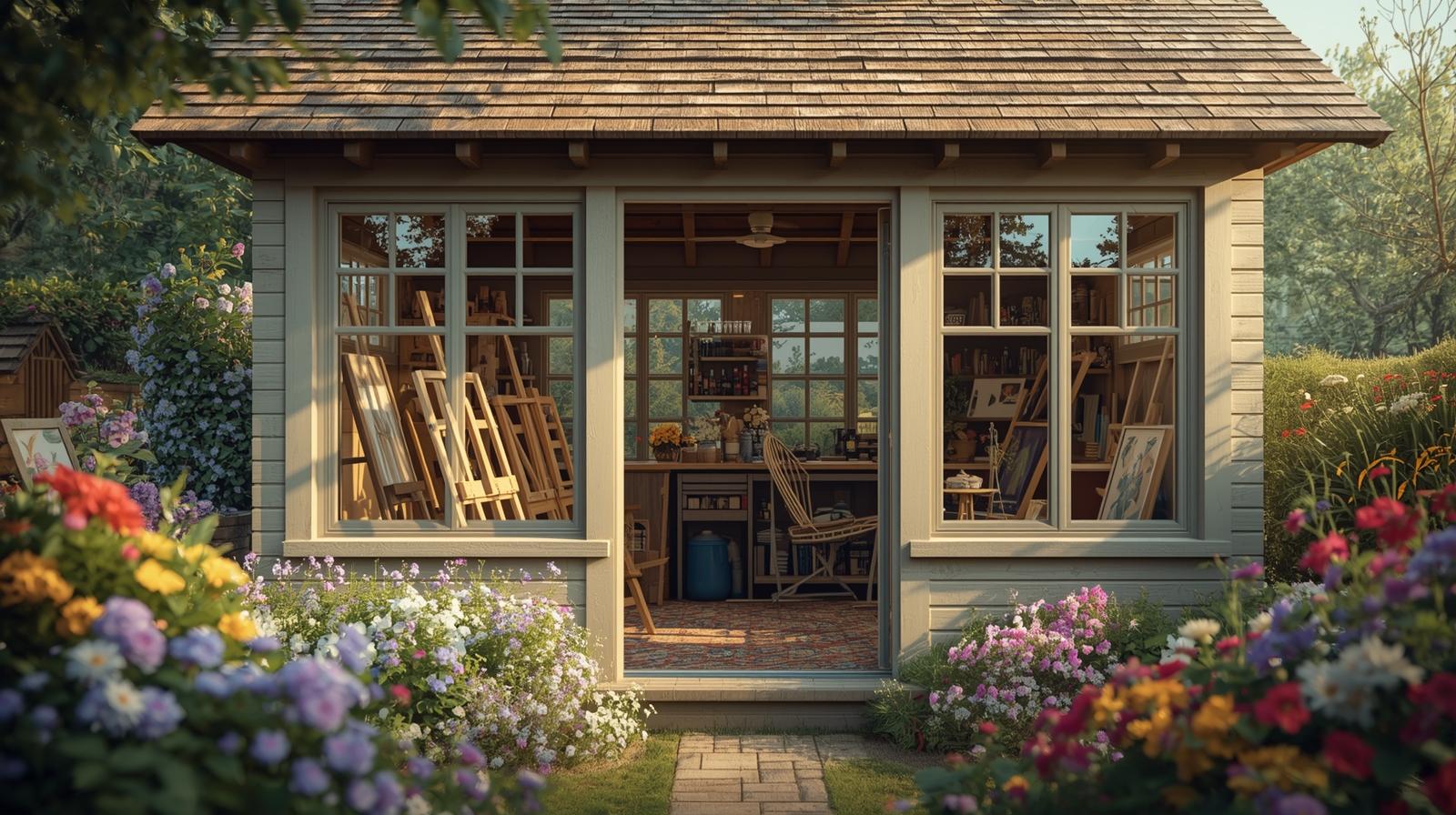 Ideal for artists, this shed can be a bright and inspiring space for painting, crafting, or other creative work. Large windows provide natural light and a view of the garden.